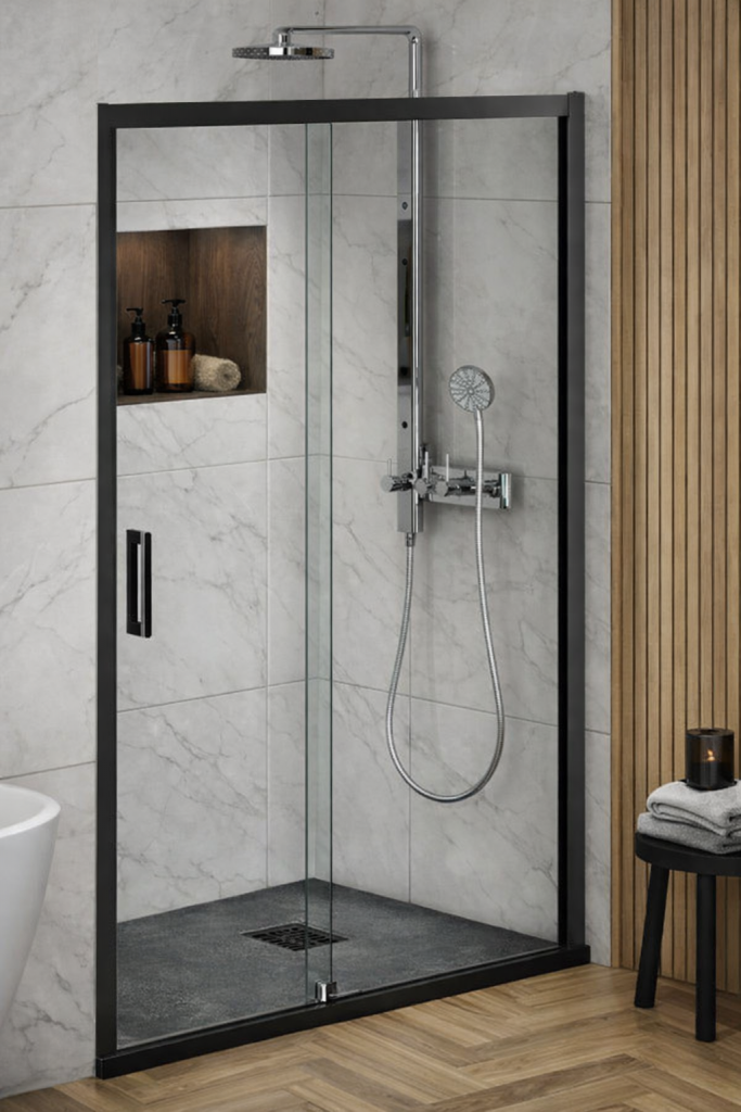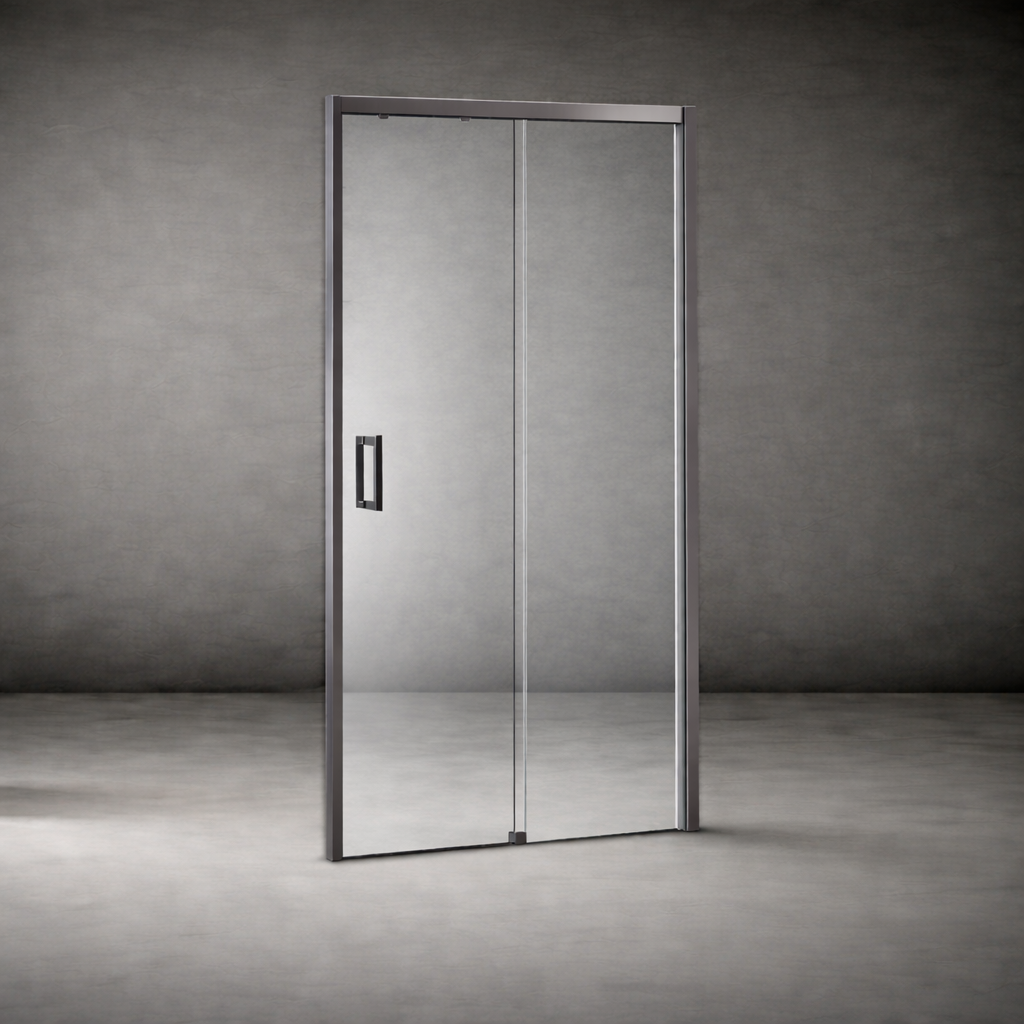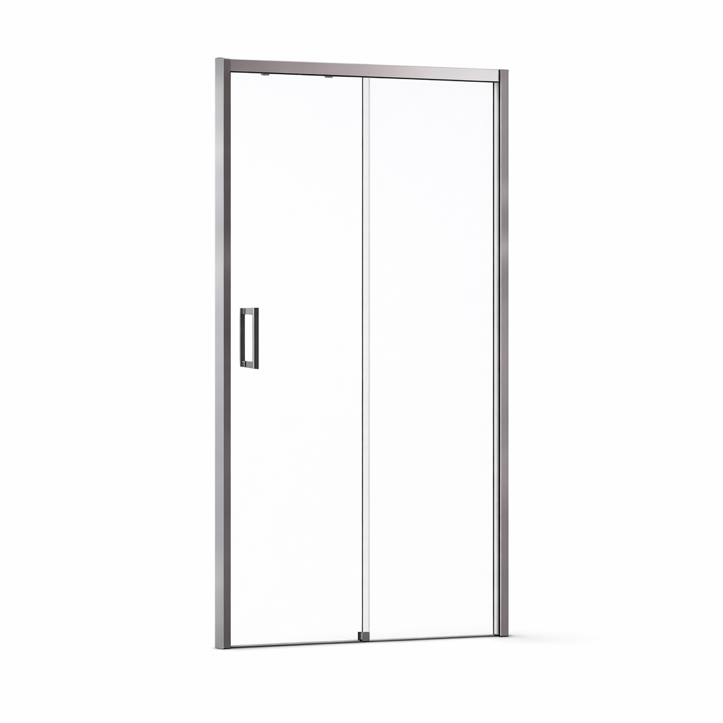 Esta mampara frontal puede ser una hoja fija u una hoja corredera. Cuenta con una cristal de un grosor de 8 mm transparente y el material utilizado es aluminio cromado con brillo. Incluye corrector de desnivel y cierre magnético.