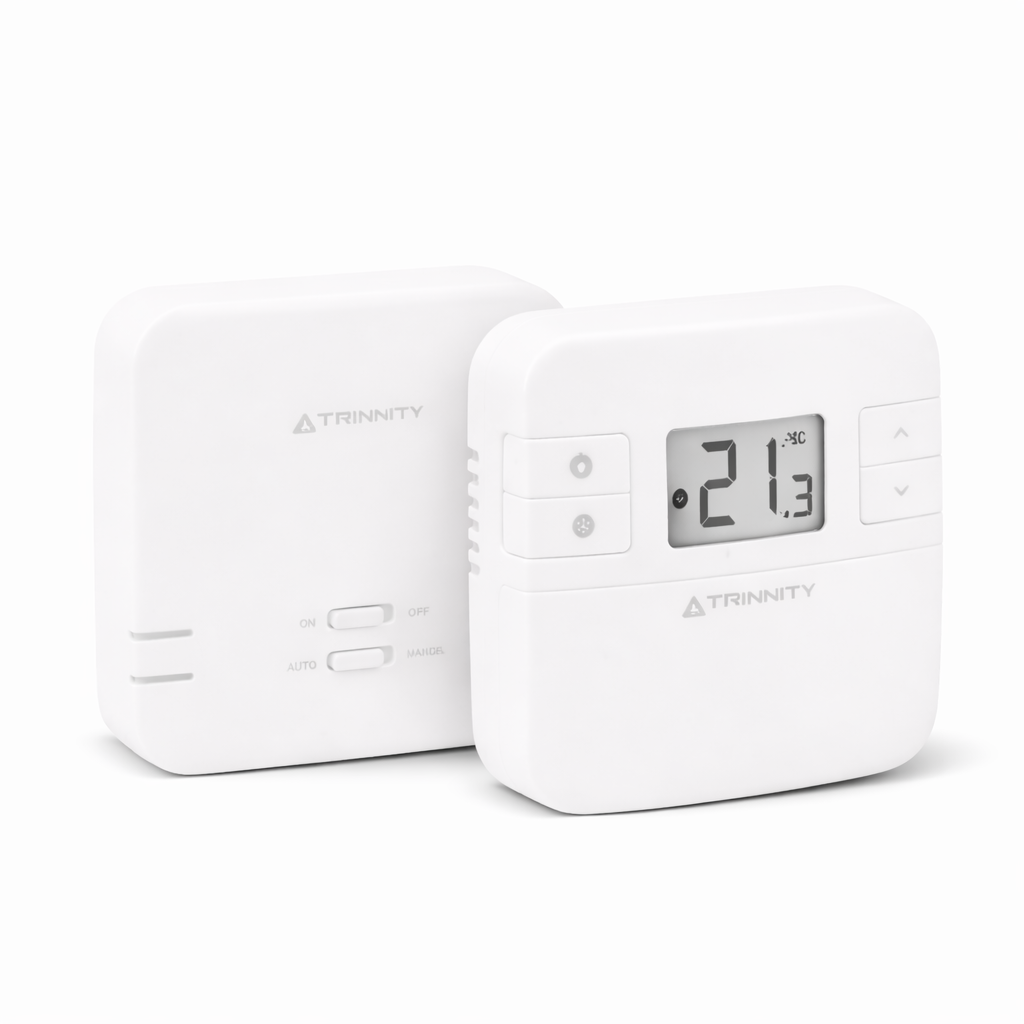Elegante termostato frío/calor con un moderno diseño y pantalla LCD retroiluminada. Dispone de cuatro pulsadores para aumento y disminución de temperatura de consigna, función antihielo, cambio frío/calor e iluminación de pantalla.