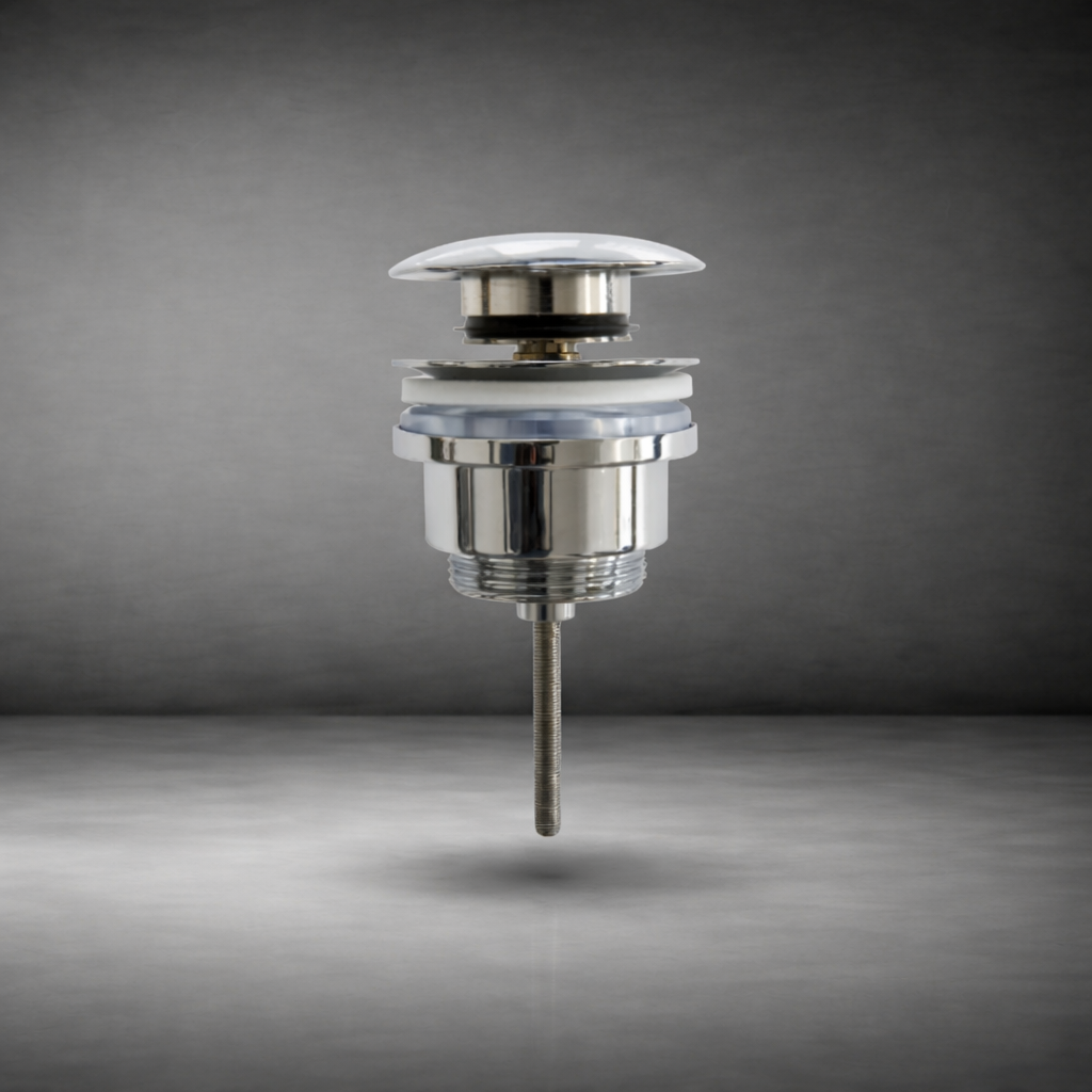 La válvula tipo click-clack permite abrir y cerrar el desagüe del lavabo con un simple toque, combinando comodidad y diseño moderno.